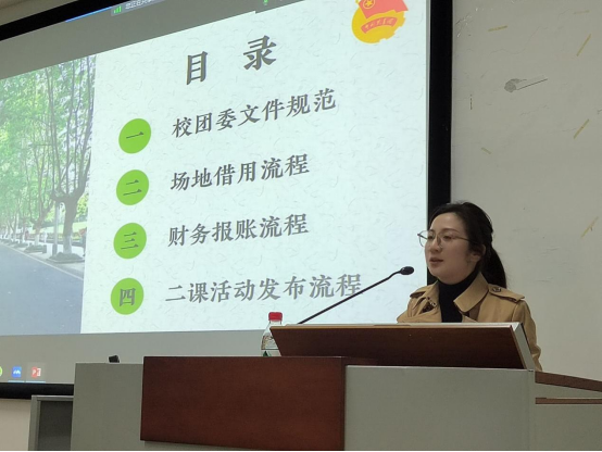 李蓟从校团委文件规范出发,围绕校团委基础工作为58期团校学员详细介绍了场地借用、财务报账、二课活动发布等工作的开展流程,并通过以往案例告诫大家,在工作中要遵守相关要求,严于律己。李蓟强调,作为团学骨干要不断提升个人能力,勇于担当责任,以认真仔细的态度对待各项工作。