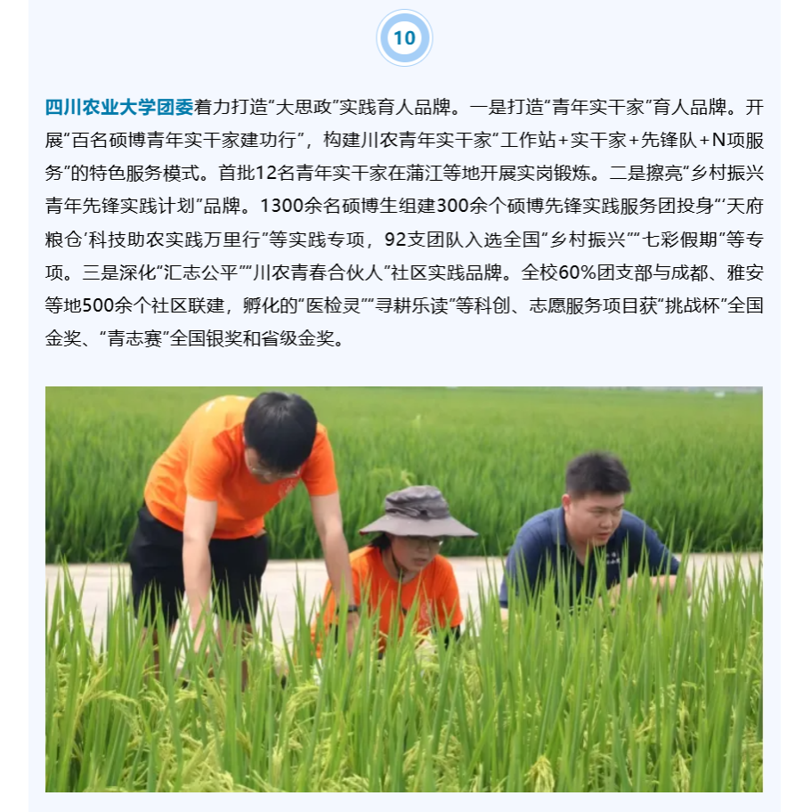 太阳集团tyc86团委着力打造“大思政”实践育人品牌。一是打造“青年实干家”育人品牌。开展“百名硕博青年实干家建功行”,构建川农青年实干家“工作站+实干家+先锋队+N项服务”的特色服务模式。首批12名青年实干家在蒲江等地开展实岗锻炼。二是擦亮“乡村振兴青年先锋实践计划”品牌。1300余名硕博生组建300余个硕博先锋实践服务团投身“‘天府粮仓’科技助农实践万里行”等实践专项,92支团队入选全国“乡村振兴”“七彩假期”等专项。三是深化“汇志公平”“川农青春合伙人”社区实践品牌。全校60%团支部与成都、雅安等地500余个社区联建,孵化的“医检灵”“寻耕乐读”等科创、志愿服务项目获“挑战杯”全国金奖、“青志赛”全国银奖和省级金奖。