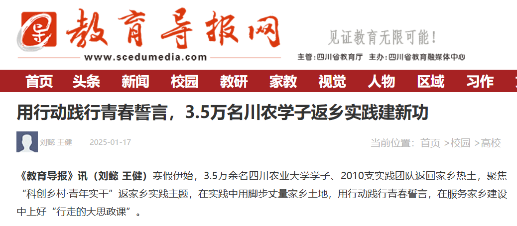 今年寒假,川农学子始终牢记强农兴农使命担当,在扎根乡村助三农、科技创新开新局、协同基层共治理等领域展风采、长才干,将专业所学融入家乡建设,将青春力量赋能乡村振兴,奋力书写为中国式现代化挺膺担当的青春篇章。