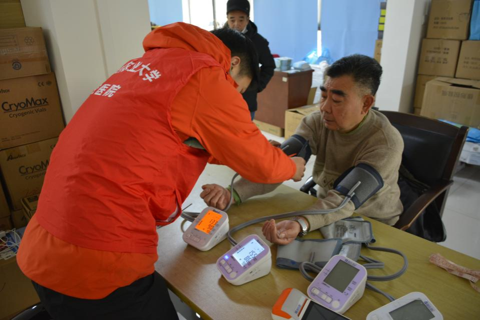 图为 杏林春暖团队成员帮老人测量血压