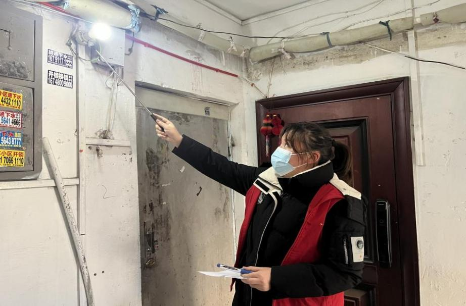 图为水利水电学院李佳桐在检查楼道声控灯