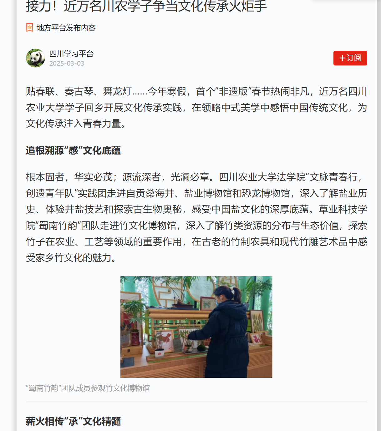“文化传承要坚持守正创新”,川农学子积极响应号召,于实践中探索文化传承新路径,推动传统技艺焕发新生机。
