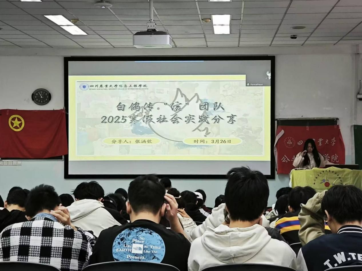 与此同时,我校构建“实践淬炼-宣讲赋能-成长提升”三维联动育人体系,组织化推进实践成果进支部、进课堂,形成了“育人育己、知行互鉴”的双向赋能新格局。川农青年说、实践微沙龙、社会实践进课堂、主题班团活动……50余个优秀实践团队或个人走到同学身边分享实践故事、畅谈实践感悟,为同学开展实践提供了新思路、注入了新动力。