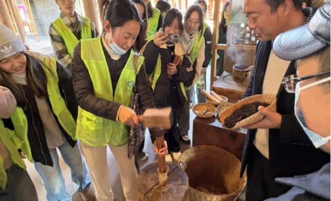 图为“茶缘藏情・蜀衍藏茶溯脂队”成员制作舂包