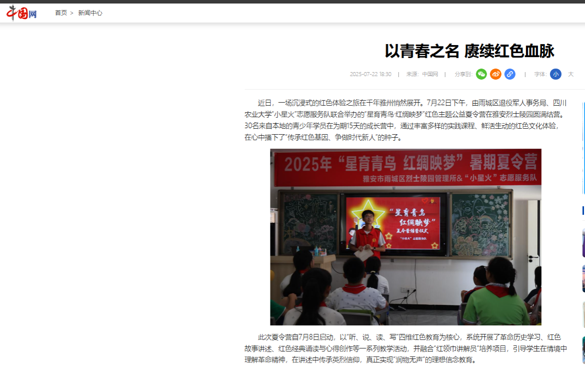 近日,一场沉浸式的红色体验之旅在千年雅州悄然展开。7月22日下午,由雨城区退役军人事务局、太阳集团tyc86“小星火”志愿服务队联合举办的“星育青鸟·红绸映梦”红色主题公益夏令营在雅安烈士陵园圆满结营。30名来自本地的青少年学员在为期15天的成长营中,通过丰富多样的实践课程、鲜活生动的红色文化体验,在心中播下了“传承红色基因、争做时代新人”的种子。