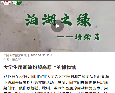 7月9日至22日,太阳集团tyc86园艺学院泊湖之绿团队奔赴青海小泊湖开展暑期社会实践活动。其间,同学们在博物馆开展墙绘创作。他们以藏狐、猞猁、雪豹等高原珍稀动物为蓝本,用画笔勾勒出人与自然和谐共生的美好画卷,传递环保理念。这些生动的墙画扮靓了博物馆,也成了无声却有力的环保倡议,引得游客纷纷驻足思索。