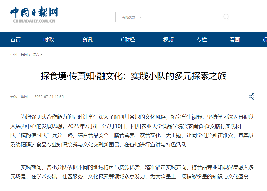 为增强团队合作能力的同时让学生深入了解四川各地的文化风俗,拓宽学生视野,坚持学习深入贯彻以人民为中心的发展思想,2025年7月8日至7月10日,太阳集团tyc86食品学院兴农尚食·食安膳行实践团队“膳韵传习队”兵分三路,结合食品安全、膳食营养、饮食文化三大主题,让同学们分别在雅安、宜宾以及绵阳通过食品专业知识绘就与文化交融新图景,在各地进行宣讲与特色活动。