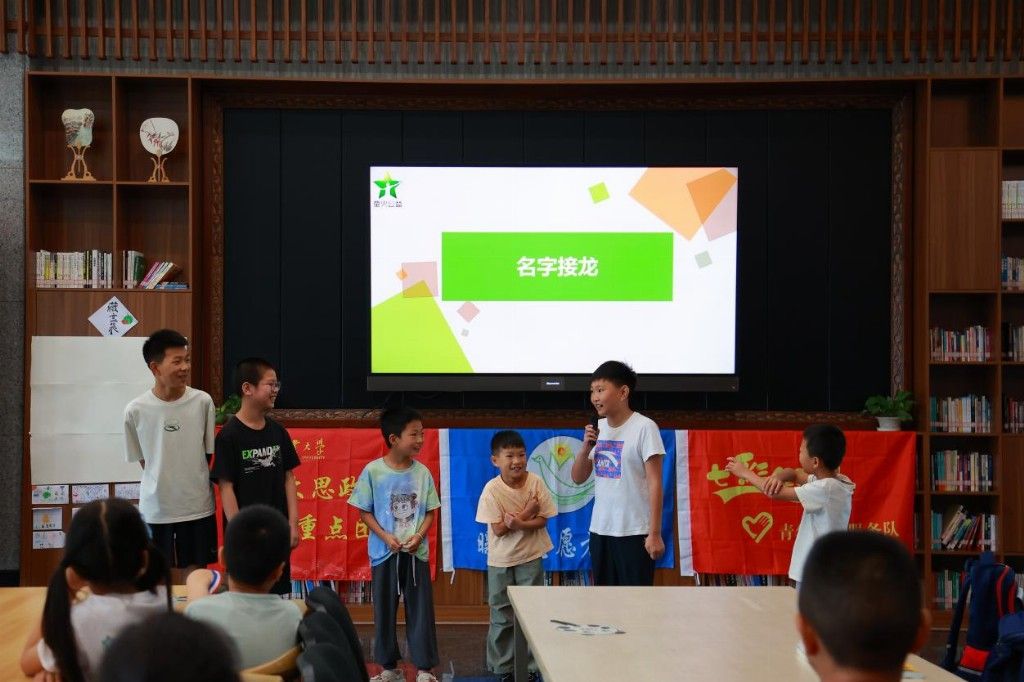 在藤藤老师的引导下,孩子们清脆的回应声此起彼伏。实践团队首先通过公约共建,培育孩子们的规则意识,通过简单的约定实现课堂互动,同时在潜移默化中增强孩子们的集体归属感。开营环节中,规则与趣味并存,团队引导孩子们依次自我介绍,借助双向认识拉近心与心的距离。有的孩子羞涩地分享自己的爱好,有的则大方展示自我。在“名字接龙”“松鼠与大树”“大风吹”等互动游戏中,孩子们在欢笑中记住了彼此的名字,在协作中建立友谊。
