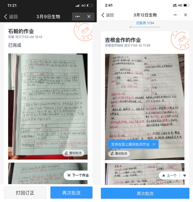 线上教学的质量得到了保证,课后的复习巩固也尤为重要。支教团成员陈颐萱于每晚固定时间布置好学生第二天的学习任务,包括线上观看教学视频、整理学习笔记、练习课程习题等。陈颐萱在使用钉钉软件批改作业过程中,将优秀作业展示在学习群中供参考,激励更多同学们更好地完成学习任务。支教团成员曹怡沛利用周三和周五为作业答疑时间,在班级群里解答同学们的疑问,并发布一些与课程相关的纪录片视频,希望同学们学习到书本知识的同时,能提高学生对于生物课程的兴趣。