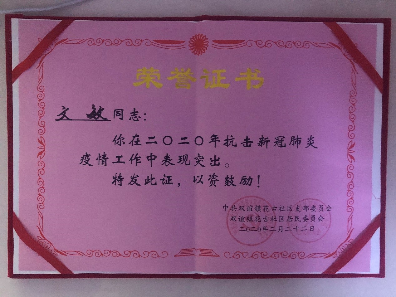 作为一名在校的大学生,文敏选择了冲在前线,尽一份自己力量。每天的入户排查、填写各家各户的情况和防疫知识的宣传。每天入户同一户两次,询问相关的信息和情况,向每天入户的人宣传普及知识,以引起他们的重视和增加他们的防疫知识。她说道,在这场无硝烟的战争中,全国上下同心协力,共同抗击疫情,没有一个人可以置身事外。