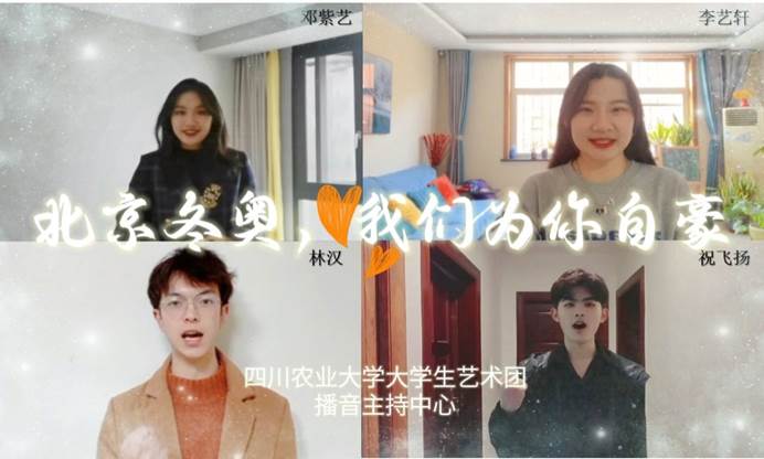 “沸腾的中国心像傲雪红梅,向世界传递芬芳和美好。” “我们都需要爱,大家把手都牵起来。”“愿冬奥有你,冬奥有我,一起向未来。”…… 一句句宣传语,一声声旋律情,在云端传递川农青年学子迎东奥的喜悦。北京2022年冬奥会的脚步越来越近,为共赴冰雪盛事,进一步弘扬奥林匹克精神,我校青年学子通过10余项花式迎冬奥系列主题活动,燃动青春,宣传冬奥,一起向未来。