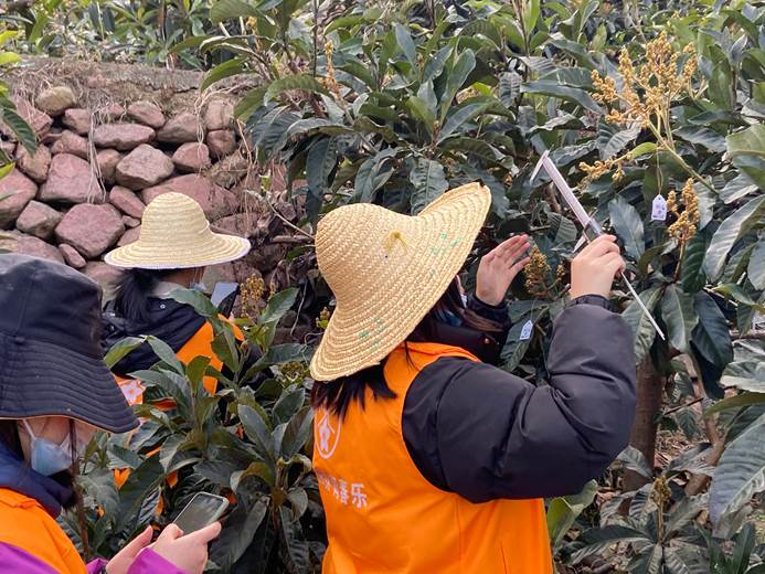 春花悦青春悦团队在品种推广中测量春花枇杷的花序