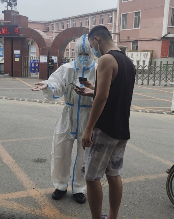 图为陆冰同学在记录社区人员进出信息
