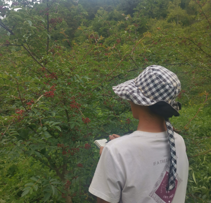 图为马巫散同学在记录树木生长状况