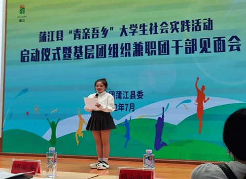(图为青马学员唐芯雨作为代表在蒲江团县兼职团干部见面会上发言)