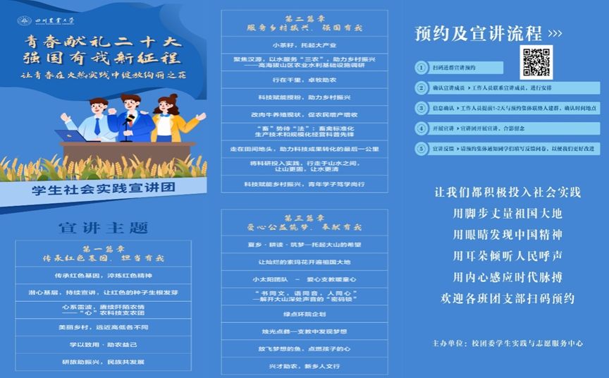 为了使宣讲冒热气、有温度,校团委联合马克思主义学院通过建设思政实践课和实践宣讲进形策课两种方式,一体化建设社会实践思政课品牌,努力打造贴近青年的社会实践宣讲工作格局。每年宣传团从全校优秀的实践团队中遴选政治思想表现好、表达能力强、实践经验丰富的宣讲骨干充实到宣讲团队伍,不断壮大宣讲队伍。第三季宣讲团由形势与政策教研室主任李晓辉老师和团委彭小芮老师共同指导,集体开展党的二十大精神专题学习,集体备课,标准化课件,针对不同年级、不同专业的的川农学子选择宣讲素材,运用讲故事、谈体悟、析案例的方式,将生动的实践融入党的二十大精神宣讲,融入粮食安全的中国策、一国两制、疫情防控与经济社会发展等形策课专题内容,以“共情”达到“共鸣”。
