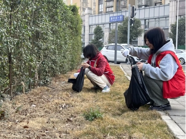 图为志愿者于社区捡拾垃圾