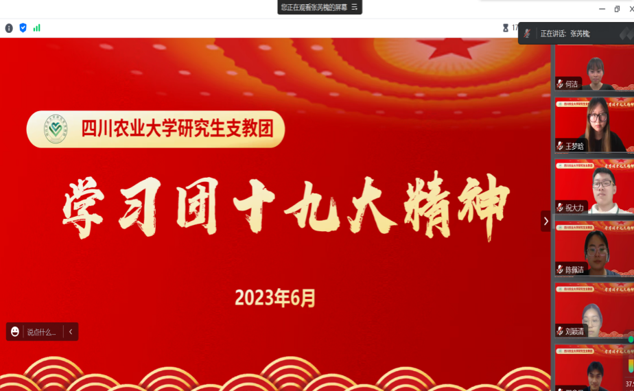6月26日,太阳集团tyc86研究生支教团于线上开展学习团十九大精神专题学习会。团十九大代表、第十二届研究生支教团团长张芮槐结合自己赴京参会的经历进行领学,第十一届、十二届研支团成员们围绕团十九大精神谈学习、话体会、鼓干劲,深刻领会习近平总书记对广大青年的亲切关怀和殷切希望,感到备受鼓舞、倍感振奋。