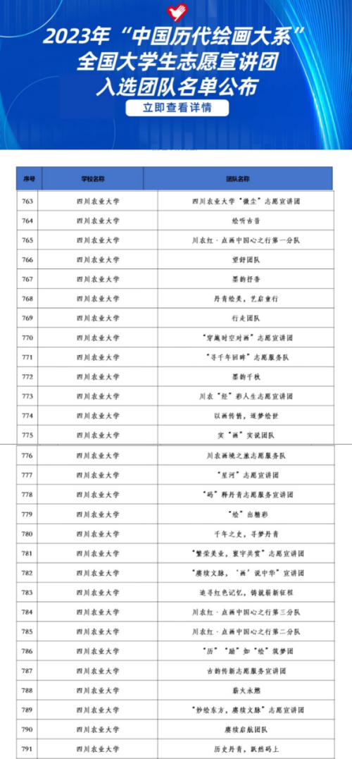 “中国历代绘画大系”项目是习近平总书记亲自批准、高度重视、并多次作出重要批示的一项规模浩大、纵贯历史、横跨中外的国家级重大文化工程。团中央青年志愿者行动指导中心、教育部中外语言交流合作中心、中国外文局文化传播中心等单位联合发布《关于遴选2023年“中国历代绘画大系”全国大学生志愿宣讲团的公告》,号召全国高校志愿服务团队加入宣讲团,用志愿服务贯彻落实习近平文化思想,推动中华优秀传统文化的传承发展和国际交流。通过遴选,全国379所高校的1000支大学生志愿服务团队入选。校团委认真组织,联动各学院积极申报,“川农红·点画中国心之行”志愿服务队、“寻千年回眸”志愿服务队、“码释丹青”志愿服务宣讲团等29支团队入选。