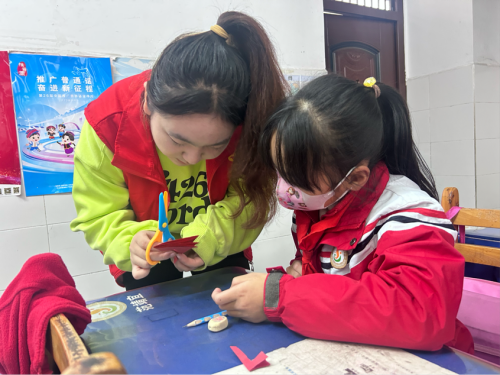 图为飞翼片羽团队成员对乡镇儿童进行非遗文化讲授