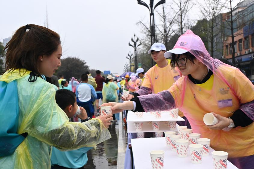 图为2.5KM补给站志愿者为参赛人员发放饮用水