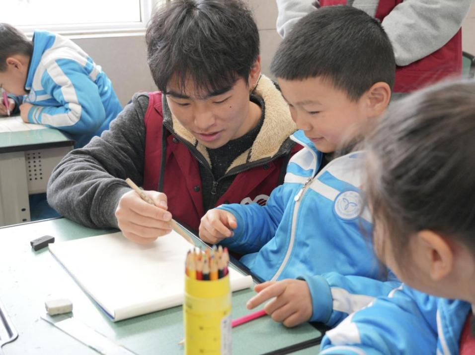 图为动物科技学院志愿者教小朋友画雷锋