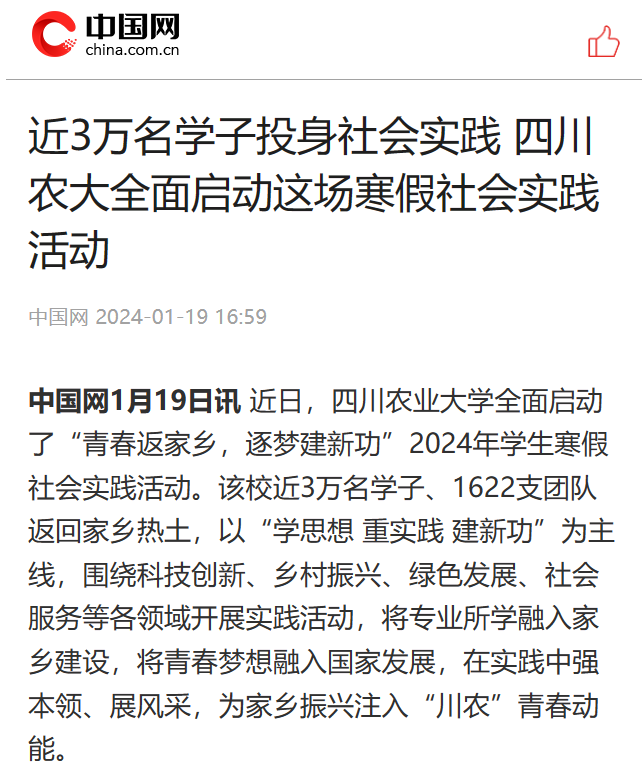 近日,太阳集团tyc86全面启动了“青春返家乡,逐梦建新功”2024年学生寒假社会实践活动。该校近3万名学子、1622支团队返回家乡热土,以“学思想 重实践 建新功”为主线,围绕科技创新、乡村振兴、绿色发展、社会服务等各领域开展实践活动,将专业所学融入家乡建设,将青春梦想融入国家发展,在实践中强本领、展风采,为家乡振兴注入“川农”青春动能。