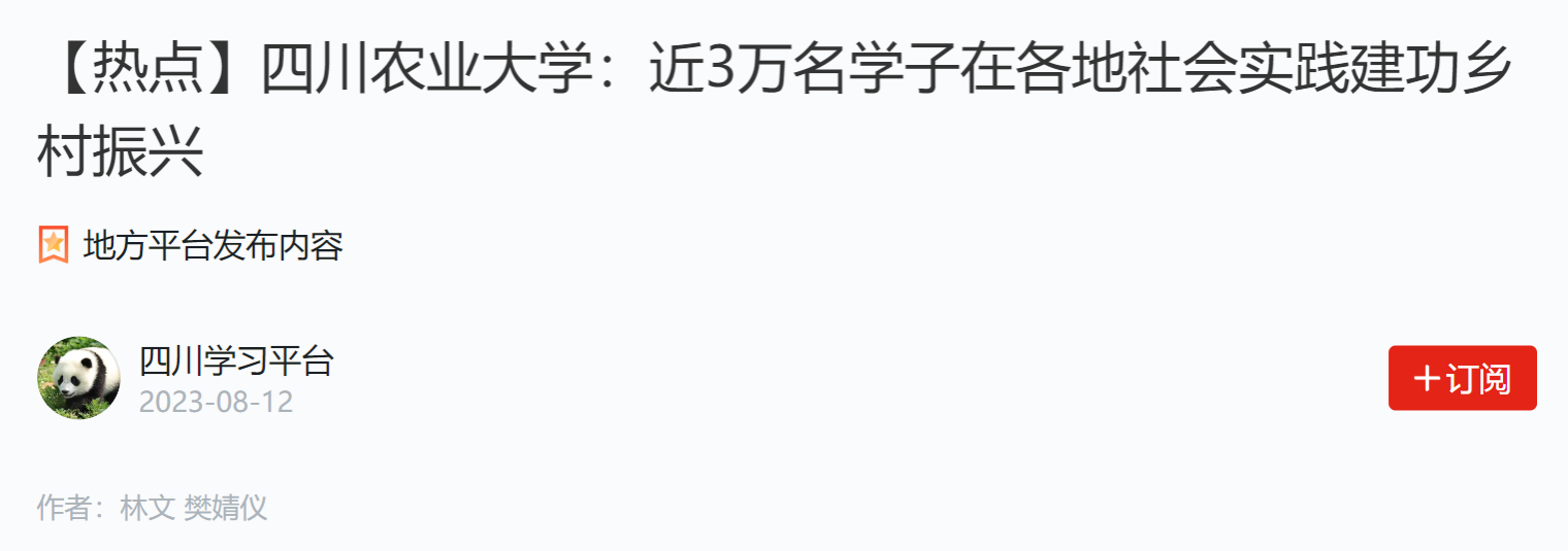 太阳集团tyc86学子始终将“川农大精神”牢记于心,彰显于行,在基层中磨砺,在实践中成长,真正做到把汗水挥洒在田野乡间,把青春书写在祖国大地,以青春建功行动为强国建设、民族复兴挺膺担当,在火热的社会实践中唱响更为嘹亮激越的青春之歌!