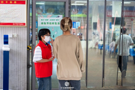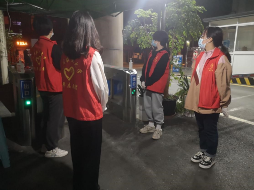 “请大家不要拥挤、有序进入超市选购用品,谢谢配合。”每到就餐时刻,食堂、超市等人员密集、易导致疫情传播的场所,志愿者们便会时刻注意控制人员流量,提醒隔位用餐并于餐前餐后戴好口罩。晚间休息时刻,校园各处又会出现夜间“志愿红”的巡逻身影,对人流密集点进行提醒疏散,降低疫情传播的所有可能性。