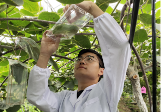 图为 猕猴桃科技小院博士支农助农服务团队对枝干溃疡进行监测