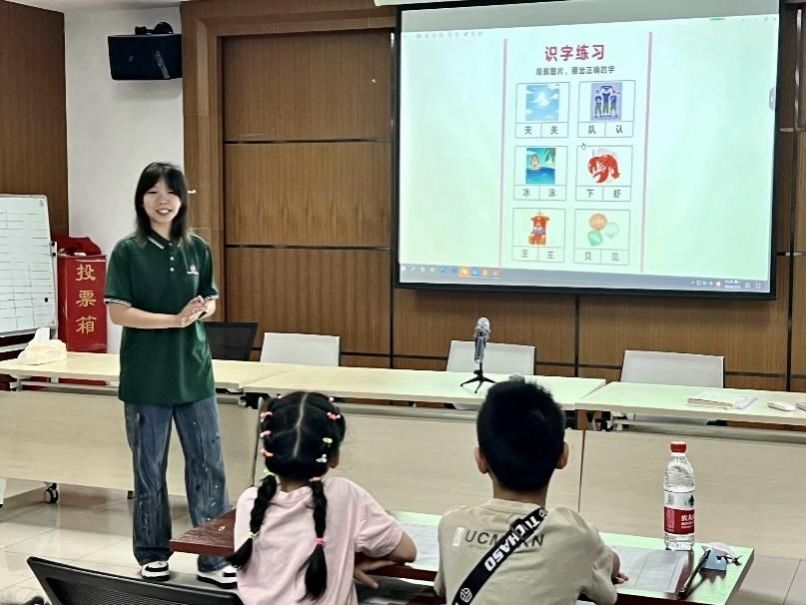 图为“普韵千里”团队成员给小朋友讲解形近字