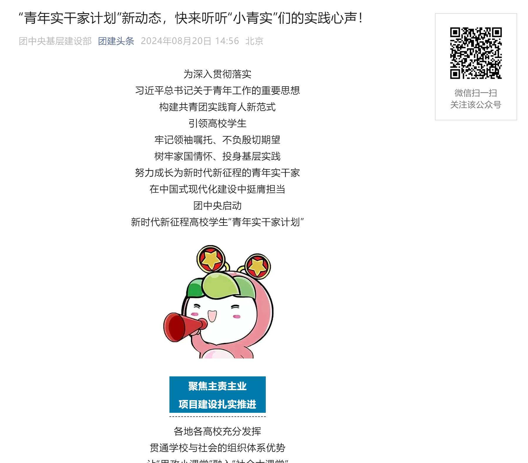 为深入贯彻落实习近平总书记关于青年工作的重要思想构建共青团实践育人新范式引领高校学生牢记领袖嘱托、不负殷切期望树牢家国情怀、投身基层实践努力成长为新时代新征程的青年实干家在中国式现代化建设中挺膺担当团中央启动新时代新征程高校学生“青年实干家计划”