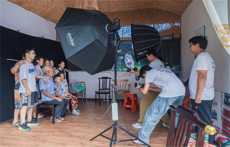 在石家村,有120余位80岁以上的老人,其中不少人从未拥有过自己的照片,有的人因各种原因在结婚时未能拍摄结婚照,还有的老人家中从未拍过全家福。为了给老人们留下珍贵的影像记录,也让艺术贴近村民群众,实践团队在乐活小院创建了一个特别的“天府照相馆”,为村民们拍摄了形象照、姐妹照、祖孙照以及全家福,并且赠送了打印好的照片。同时,他们还寻访村落的每个角落,记录下了上千张乡村生活的精彩瞬间。村民杨女士表示,以前从没想过自己的日常生活能被记录下来,还办成了摄影展。“看着这些照片,感觉特别亲切,就像是回到了过去那些美好的时光。”