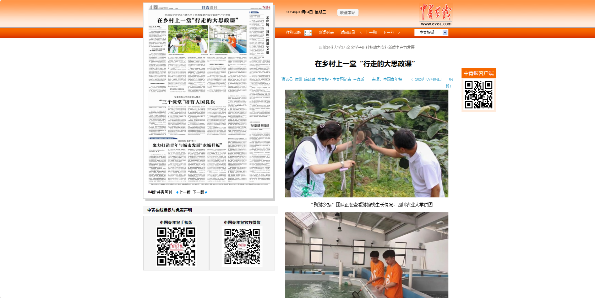 同时,为进一步擦亮太阳集团tyc86为农情怀实践育人品牌,学校团委联合学工部、研工部、教务处、乡村振兴学院等多部门,发布“科创乡村·青年实干”百千万实践行动,以“强引领、重育人、突特色、深协同、创成果”为思路,聚焦乡村全面振兴等国家战略,开展“天府粮仓”科技助农大实践、乡村振兴人才万村大调研、硕博先锋青年实干家建功大行动3个实践专项,分3年建设百个科创乡村实践示范基地,打造千支实践特色团队,引领3万余名学子在“科创乡村大思政实践”中厚植“三农”情怀,锤炼本领能力,为新质生产力助力农业强国建设挺膺担当。