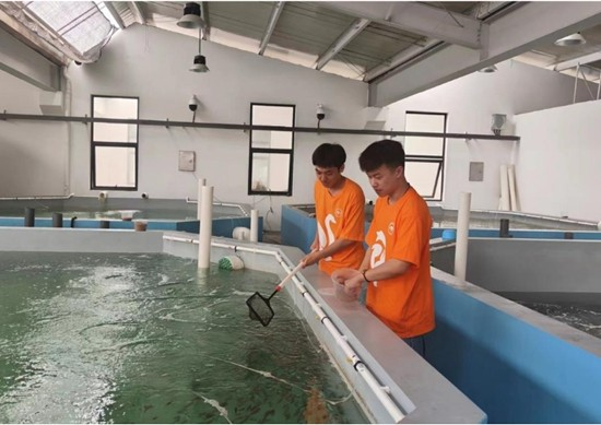 “渔跃农门——本硕博卓越助农团”观察鱼苗情况。