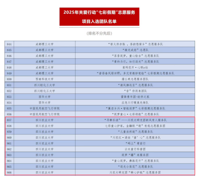 在校、院、团队等多方协同下,经济学院“七彩童心护家,金融联‘萌’有我”志愿服务团,生命科学学院云木童行科普团,信息工程学院“码上”青苗行,法学院“儿童自然说”志愿服务队,研究生支教团“寻耕乐读”——川农大研支团新风育人服务队、筑梦“疆”来服务团、川农大研支团“耕心护航”志愿服务团,学生实践与志愿服务中心“川农红·语结‘童’心”志愿服务队、“童心筑梦·彝路花开”志愿服务队,校学生会“逐光小葵花”志愿服务队从全国1229所高校8022支团队中脱颖而出成功入选。