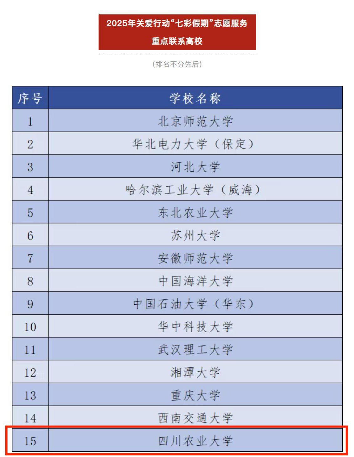 近日,团中央2025年关爱行动“七彩假期”志愿服务团入选名单公布,我校10支团队入选,入选数量居全国第一。学校同时入选2025年关爱行动“七彩假期”志愿服务重点联系高校(全国共15所)。