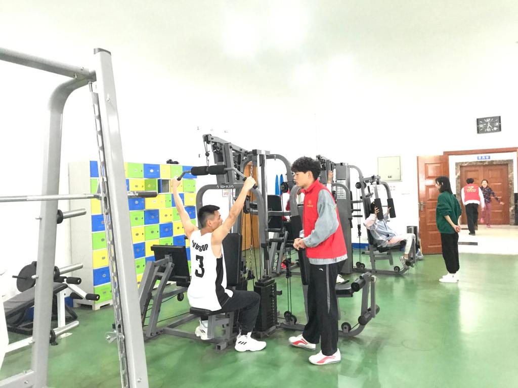 志愿者正在引导参与活动的同学进行健身锻炼