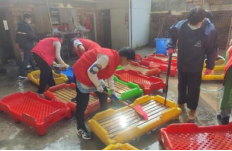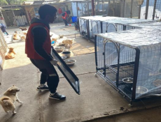 志愿者整理狗舍用品