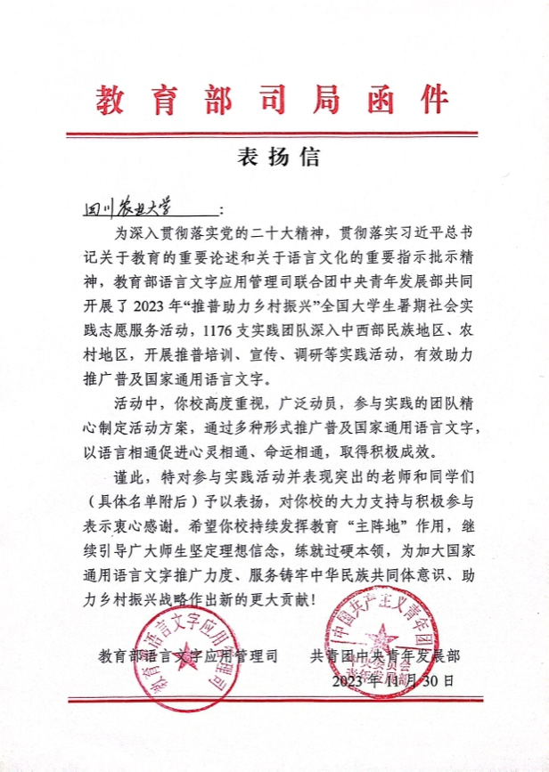 近日,由教育部语言文字应用管理司、共青团中央青年发展部共同主办的2023年“推普助力乡村振兴”全国大学生暑期社会实践志愿服务活动评优结果揭晓。来自全国1056所高校的4123支团队报名,入选推普服务队1176支,遴选出240支优秀团队。我校“索玛花开”推普实践团队荣获“优秀团队”称号并收到教育部和团中央的来信表扬。