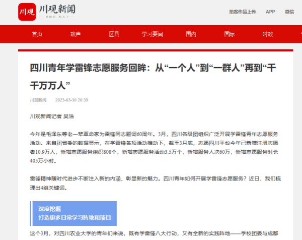 今年是毛泽东等老一辈革命家为雷锋同志题词60周年。3月,四川各级团组织广泛开展学雷锋青年志愿服务活动。来自团省委的数据显示,在学雷锋各项活动推动下,截至3月底,志愿四川平台今年已新增注册志愿者10.9万人,新增志愿服务组织808个,新增志愿服务活动3.5万个,新增服务人次60万,新增志愿服务时长405万小时。