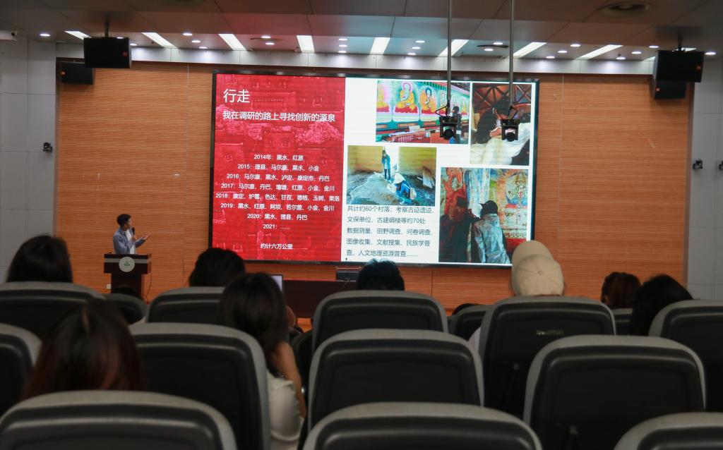 在“挑战杯”学术科研竞赛中取得优异成绩的王童和蒋思玮以不同的角度进行了分享。获得“挑战杯”学术科技作品竞赛国赛获得银奖团队负责人王童介绍了今年将在川大举行的第十七届挑战杯赛程安排,并以负责项目为例,详细地对项目申报书所需要注意的细节、撰写思路等问题进行了分析讲解。来自风景园林学院的硕士蒋思玮则着重于分享他是如何通过深入调研约60个村落、考察约70处古迹遗迹,选定以“嘉绒藏族传统文化”为线索并开始自己科研创新之路的心路历程。