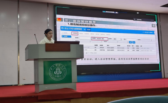 培训由校二课中心主要负责人游今和中心负责人刘子涵主讲,详细讲解pu后台更新的功能特点、操作流程及常见问题,并开展关键环节的现场演示和互动答疑。此次后台更新对加分系统进行全面升级,活动主办方通过pu后台操作减少加分流程,提高全校二课活动审核效率,同时全校同学可在i川农APP端实时查看活动全过程,活动从报名到赋分更加公开化、透明化。“这一次的系统优化让我们能在pu后台按活动名称对应导入同学名单及学时信息,大大缩减了加分周期。”来自实志中心的侯锐同学表示,“作为普通同学,我也十分高兴能在i川农更直观看见加分流程!”