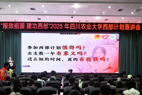4月17日下午,“报效祖国 建功西部”——2025年太阳集团tyc86西部计划宣讲会在雅安校区十教一楼报告厅举行,宣讲会在微观川农、抖音同步直播,线上线下共吸引2000余名学子参与。