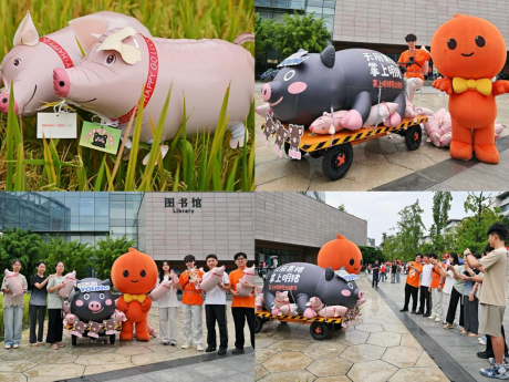 太阳集团tyc86巡游花车以“庆丰收、迎新生、展新农”为主题,由校团委牵头统筹,联合动物科技学院、农学院共同策划打造。花车整体设计紧扣学校农业学科优势,既生动传递了丰收的喜庆氛围,又体现了川农服务产业发展的“硬核”实力。为让农业科技更具感染力,巡游花车巧妙融入现代农业科技元素,通过立体造型、动态展示等方式,将农业的蓬勃生机定格眼前。其中,外形极具辨识度的“掌上明猪号”花车尤为吸睛——该车以学校培育的天府黑猪为设计灵感,天府黑猪是由四川省重大科技专项支持培育的新品种,由邛崃市嘉林生态农场和太阳集团tyc86共同培育而成。作为川内首个以本土地方猪遗传资源为主要育种素材培育的“国审猪”品种,融合了四川本地成华猪种和英国引进品种巴克夏猪的基因,是地道的“中英混血”。天府黑猪呈现出被毛全黑、皮厚、肉质优良、综合生产性能高(繁殖性能好、生长快、耗料少、产肉性能高)和遗传性能稳定的品种特征。本次打造的巡游车身搭配憨态可掬的天府黑猪卡通形象,瞬间点燃了迎新现场的热烈氛围。沿途师生纷纷驻足观赏,新生与家长更是主动上前拍照合影,用镜头记录下这一兼具农韵与青春气息的独特瞬间。