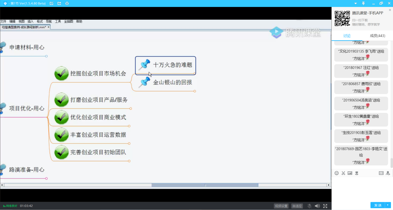第一季内容主要围绕《“互联网+”大赛基本情况》《商业计划书撰写要点》《历届金奖作品案例分析》三个专题展开,专家们从大赛概况、赛道规则、评审要点、商业计划书撰写规范、商业模式选择、经典案例分析、项目路演展示等角度向同学们进行了详细展示和说明。
