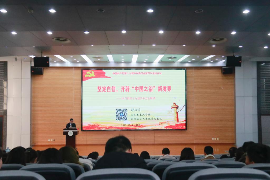 12月9日下午,团团大讲堂第三讲——“坚定自信,开辟‘中国之治’新境界——学习贯彻十九届四中全会精神”专题讲座在成都校区二教报告厅举行,学校马克思主义学院党委书记杨世义为现场500余名团员青年做分享。