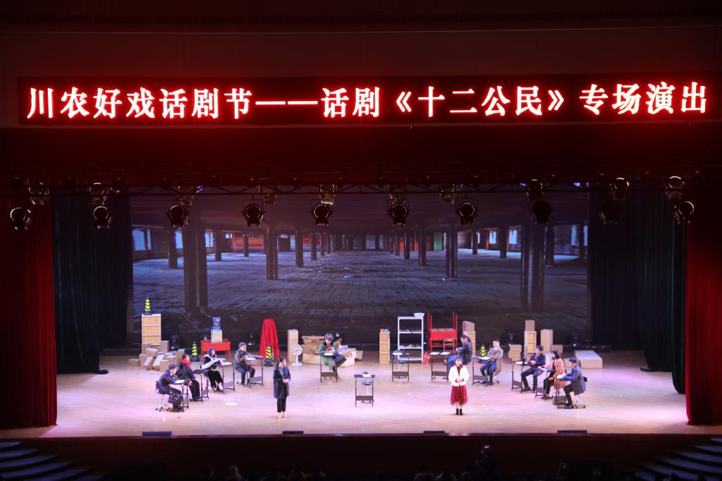 12月7日晚,由校团委、四川省公民文化普及基地、学生法律援助中心联合主办,大学生艺术团话剧分团、追梦美育工作室承办的话剧《十二公民》在雅安校区体育馆精彩上演,校党委副书记张强和两千余名师生观看演出。