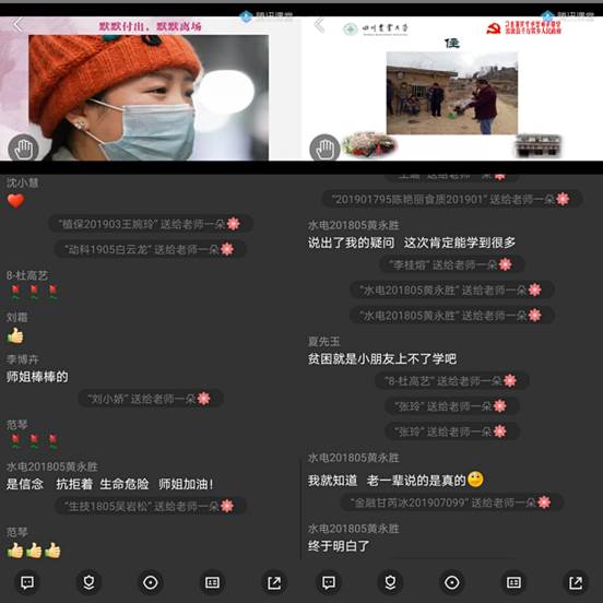 在新冠肺炎疫情最严重的时期,校友“雨衣妹妹”刘仙带着200斤猪肉、300斤大米和她的团队逆行武汉,在40多天的时间里为当地医护人员提供了超过两万份热气腾腾的免费盒饭。她从驰援武汉的经历展开了她的分享故事,当问及在江城的艰辛和困难时,她总是轻描淡写的一带而过,而谈到投身抗疫一线给她的感悟时,她表示:“说不害怕是假的,仅租住的小区就有20多例病例,白天忙于干活时不觉得,晚上回到家里时真的怕到一个人偷偷哭,这时候更加意识到只有生命才是最宝贵的。”她谈到,在内心最彷徨和无助的时候,大学班主任那一句“川农大永远在你背后支持你”给了她巨大的心理支持,让独在异乡的她热泪盈眶。在分享中得知,刘仙回川后一直在关注公益,目前正在为偏远地区的学生提供复课医疗物资而筹备口罩工厂。最后,她对师弟师妹们提出了“人无信而不立,踏实做事,要做善良真诚的人”的真诚期望。“是信念抗拒着生命危险,师姐加油!”在线观看的同学深受鼓舞,纷纷点赞或留言支持。
