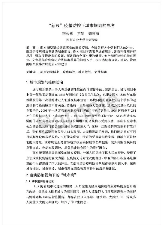 来自资源学院的李俊辉同学从专业角度查阅了有关传染病防治、城市规划管理的相关理论文献,结合案例和当前疫情,写成《“新冠”疫情防控下城市规划的思考》一文,目前文稿已在投稿阶段。
